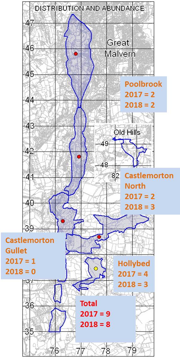 Malvern Bird-group members met to discuss the topic and it seems that one-two pairs on North Hill, two, possibly three pairs on the Worcester Beacon, two or three pairs on Castlemorton common and up to four pairs on Hollybed common might be our best estimates of relatively stable breeding territories. This excludes birds on surrounding farmland.